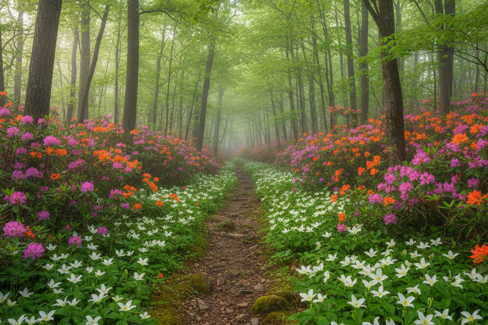 What You'll See: The show begins in early spring with ephemeral wildflowers like trillium, lady slipper orchids, and wild ginger, which bloom before the trees fully leaf out. As the season progresses, you'll see vibrant displays of flame azaleas, rhododendrons, and mountain laurel.